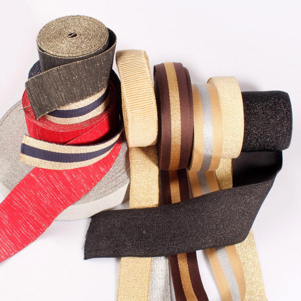 Multifunctional metallic yarn knitted elastic band is made of materials such as rubber yarn or elastic synthetic fibers. It has good elasticity, contains more natural rubber elastic fibers, has a decorative appearance, and is mainly used in clothing accessories.
